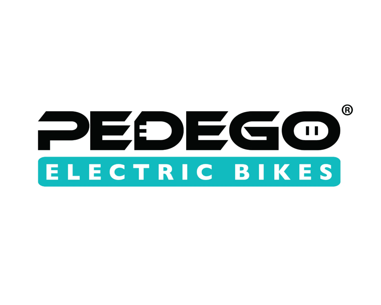 PEDEGO Electric Bikes logo with black and teal text on a white background.